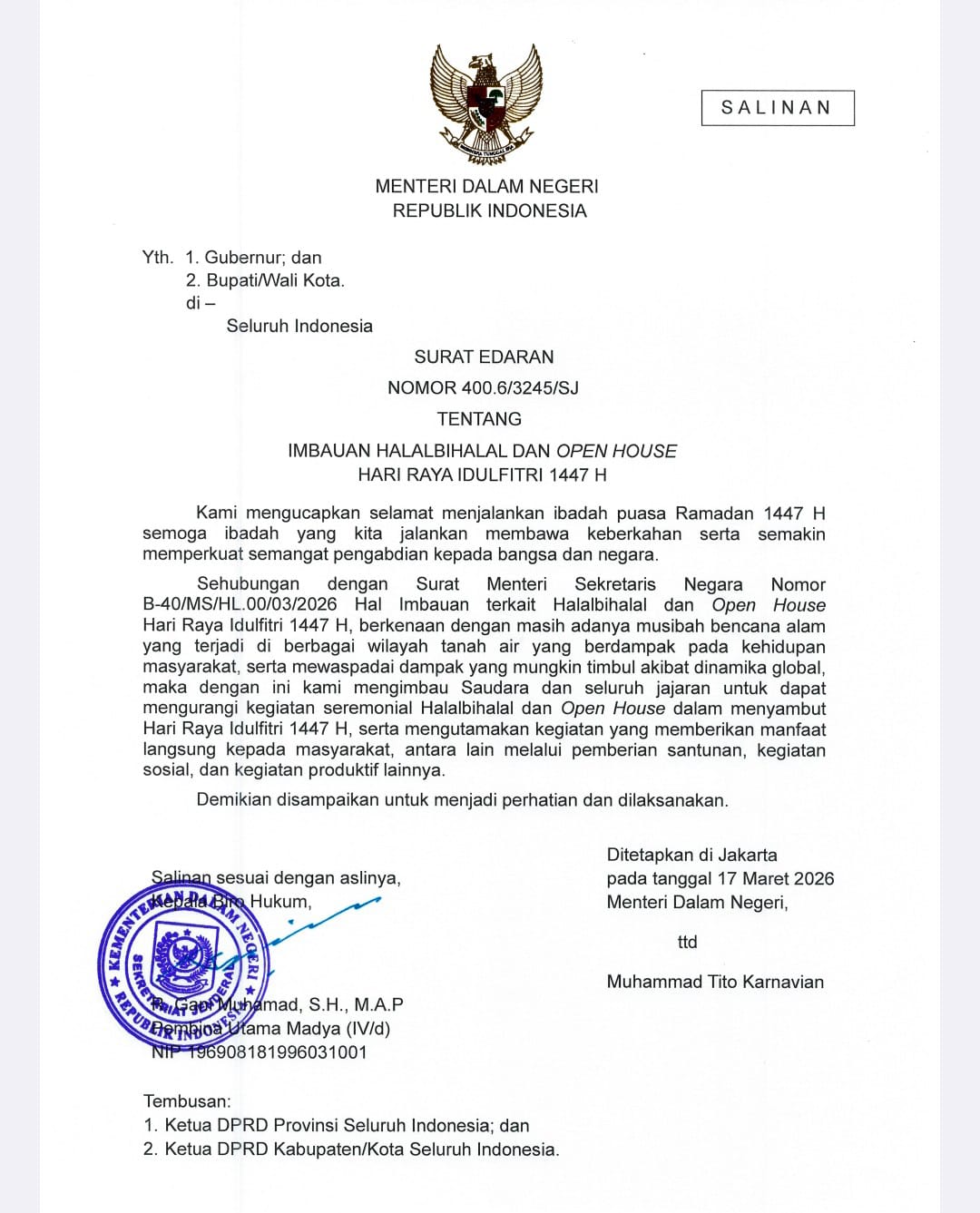 Menteri Dalam Negeri, Tito Karnavian sudah mengeluarkan Surat Edaran (SE) Nomor 400.6/3245/SJ Tentang Himbauan Halal Bihalal dan Open House Hari Raya Idul Fitri 1447 H yang tertulis berkenan dengan masih adanya musibah bencana alam yang terjadi di berbagai wilayah di tanah air serta mewaspadai dampak yang mungkin timbul akibat dinamika global maka dengan ini menghimbau saudara dan seluruh jajaran untuk mengurangi kegiatan seremonial Halal Bihalal dan Open House Hari Raya Idul Fitri 1447 H.