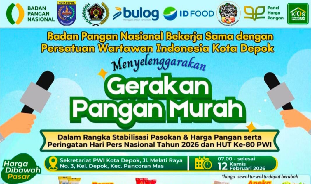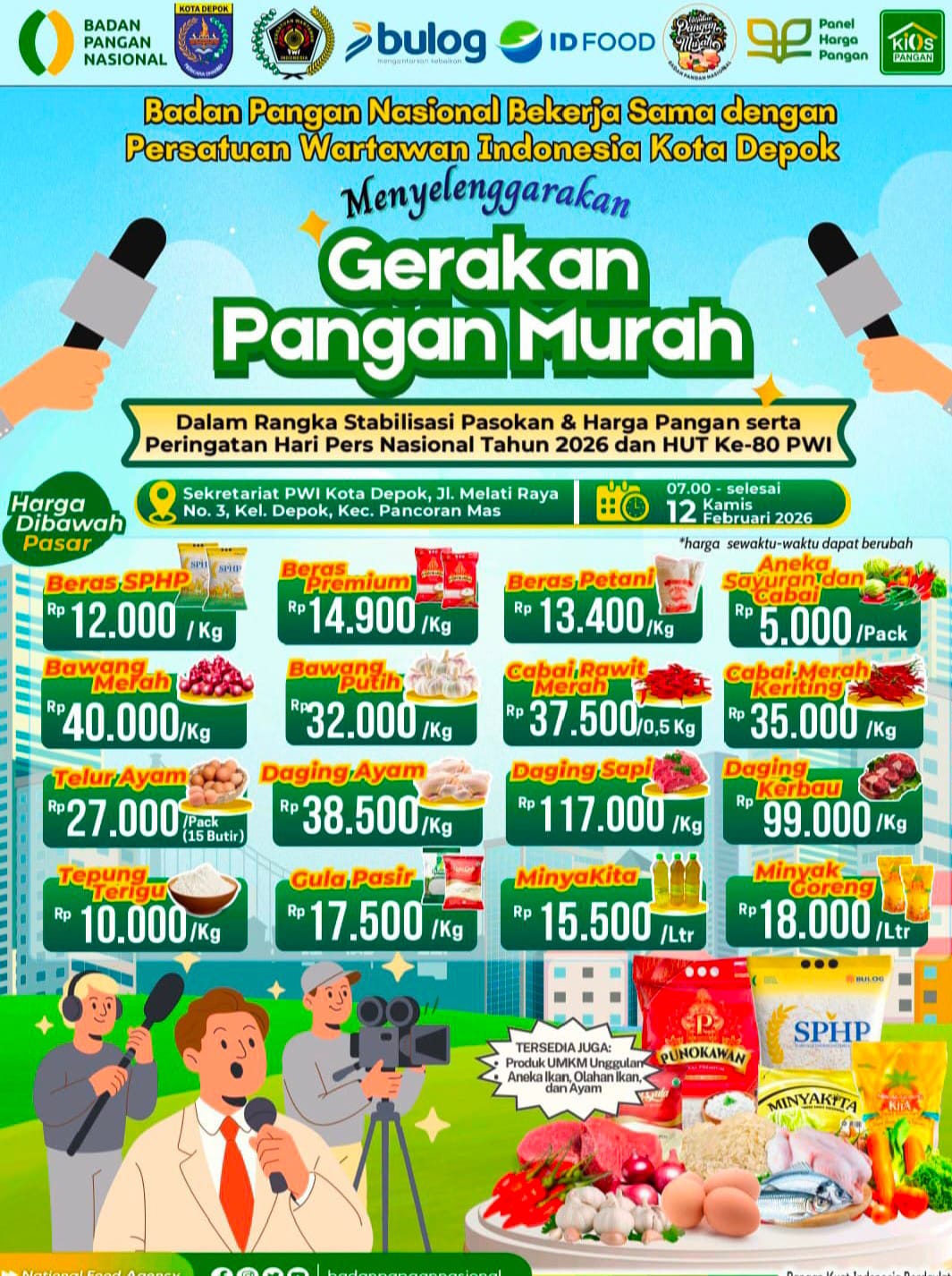 PWI Kota Depok mengandeng Badan Pangan Nasional (Bapanas) menggelar Gerakan Pangan Murah (GPM) di Kantor PWI Kota Depok di Jalan Melati Raya No 3, Kelurahan Depok Jaya, Kecamatan Pancoran Mas, Kamis 12 Februari 2026, mulai pukul 06.00 WIB hingga 12.00 WIB.