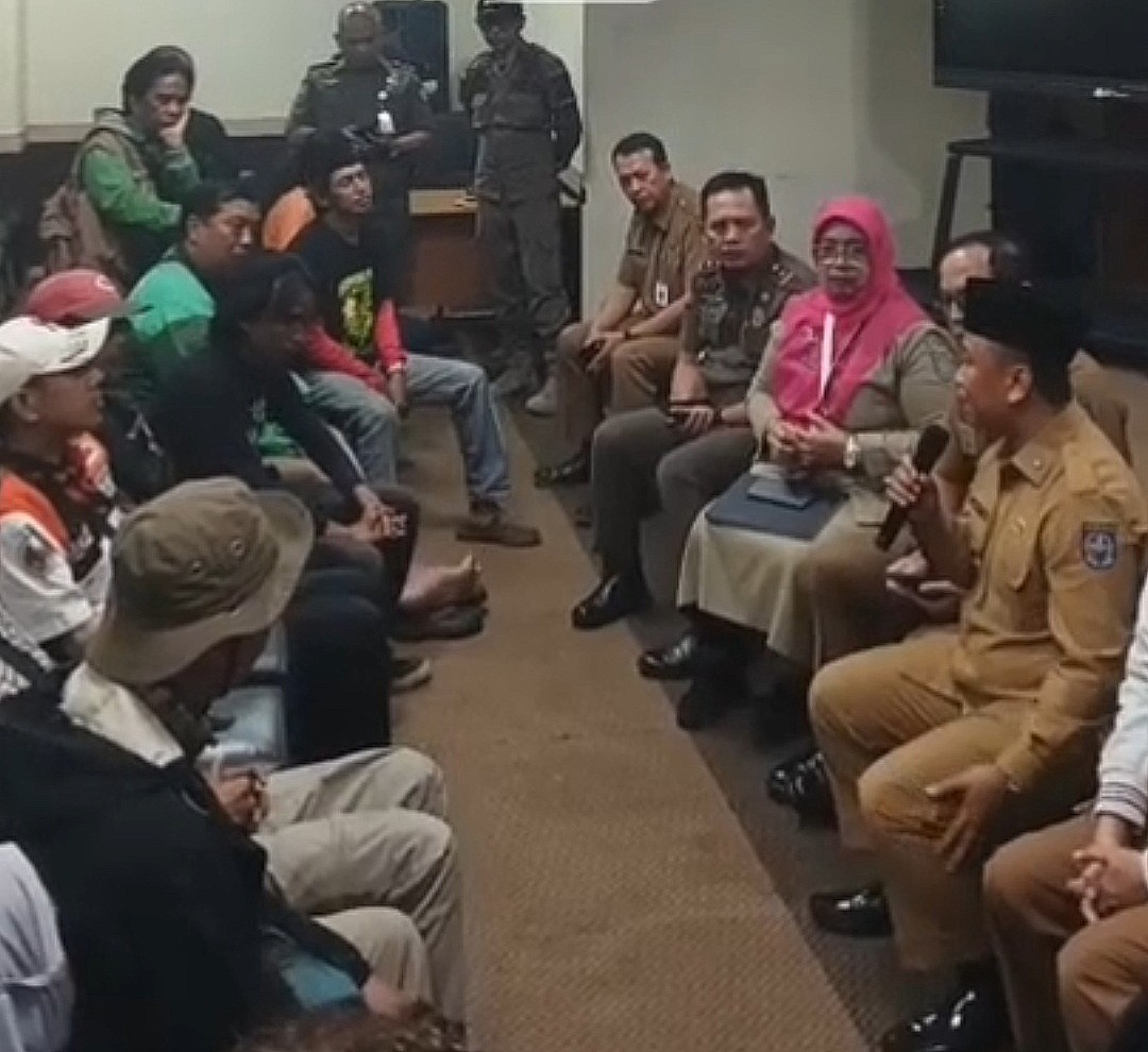 Massa aksi yang menamakan Aliansi Rakyat Bantu Rakyat tersebut sempat bertemu dengan Walikota Depok, Supian Suri.