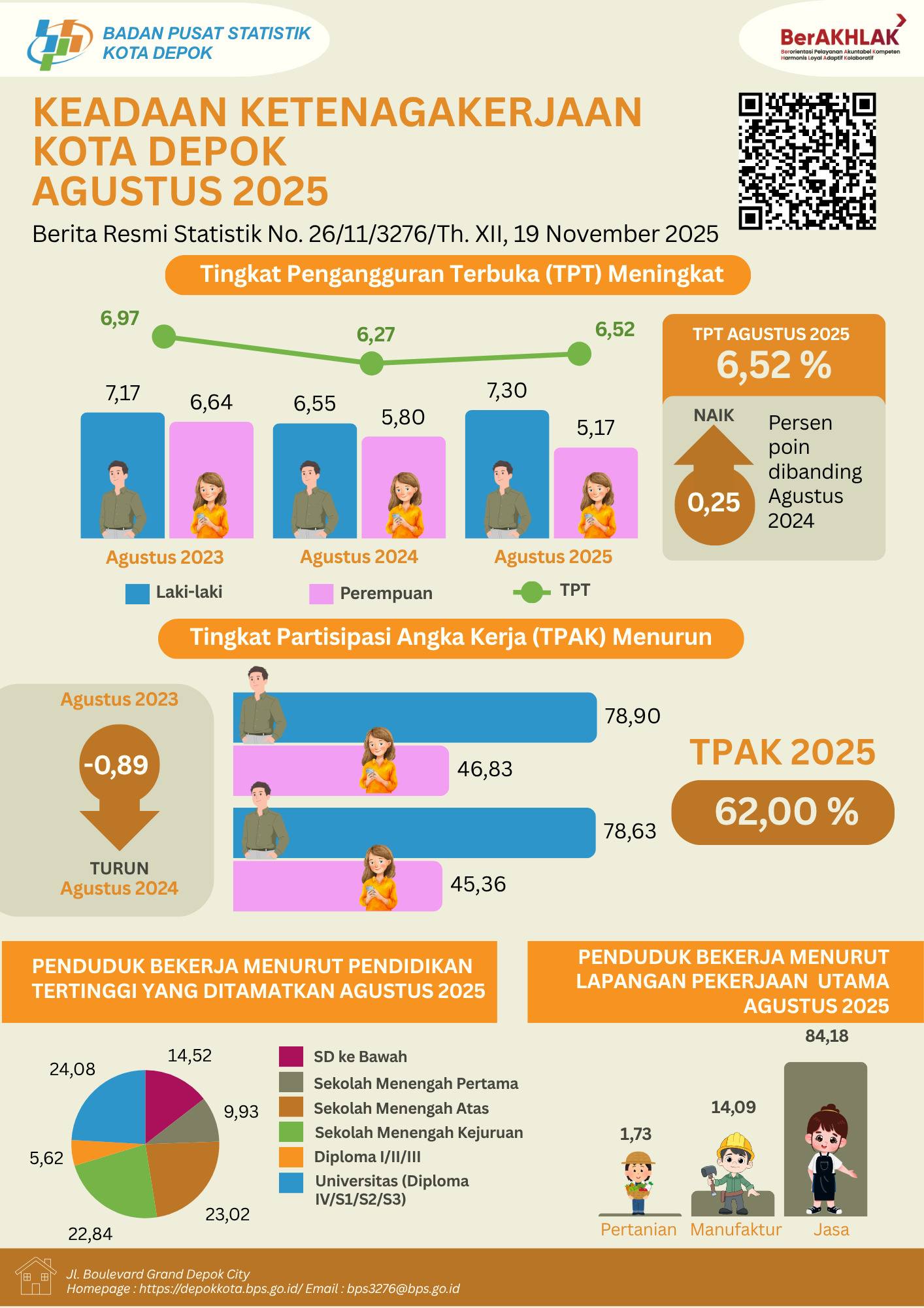 Sedangkan presentase angka pengangguran Tahun 2025, untuk laki-laki sebesar 7,30% dan untuk perempuan 5,17%, jadi TPT Agustus 2025 sebesar 6,25%. Sehingga angka pengangguran Kota Depok meningkat 0,25%.