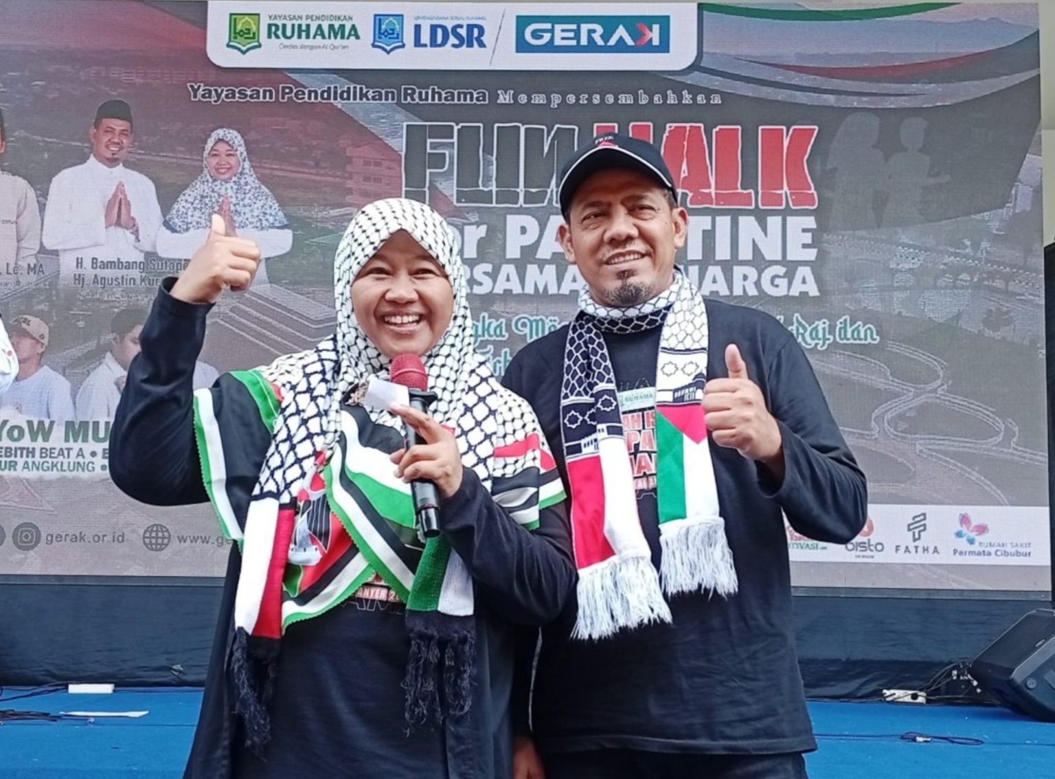 Anggota DPRD Depok, H. Bambang Sutopo di dampingi istri bersama Yayasan Pendidikan Ruhama menggelar aksi solidaritas bertajuk Fun Walk For Palestina di Alun-alun Grand Depok City (GDC), Cilodong, Depok, Sabtu (22/2/2025).