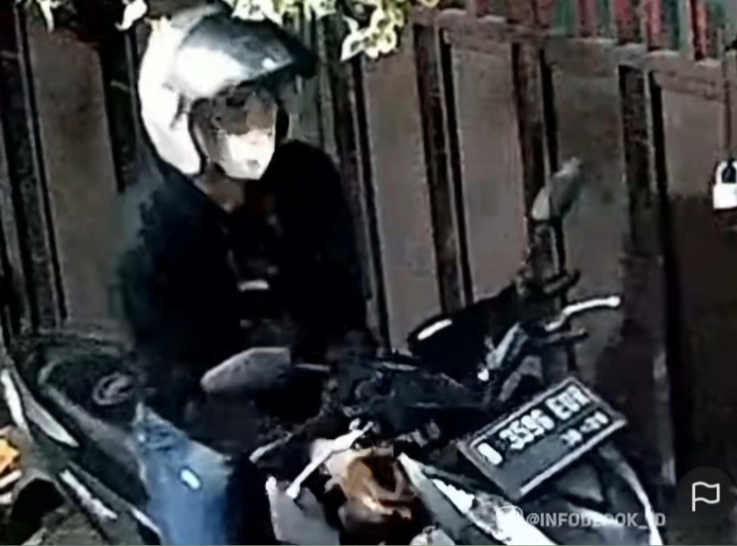 Ketika keadaan dirasa sudah aman, pelaku yang mengenakan jaket hitam, helm putih serta menutupi mukanya dengan masker putih dengan lihai membongkar lubang kunci motor dengan alat yang dibawanya. Hal itu terlihat jelas dalam video yang diunggah akun media sosial @infodepok yang telah ditonton 324,5 ribu.
